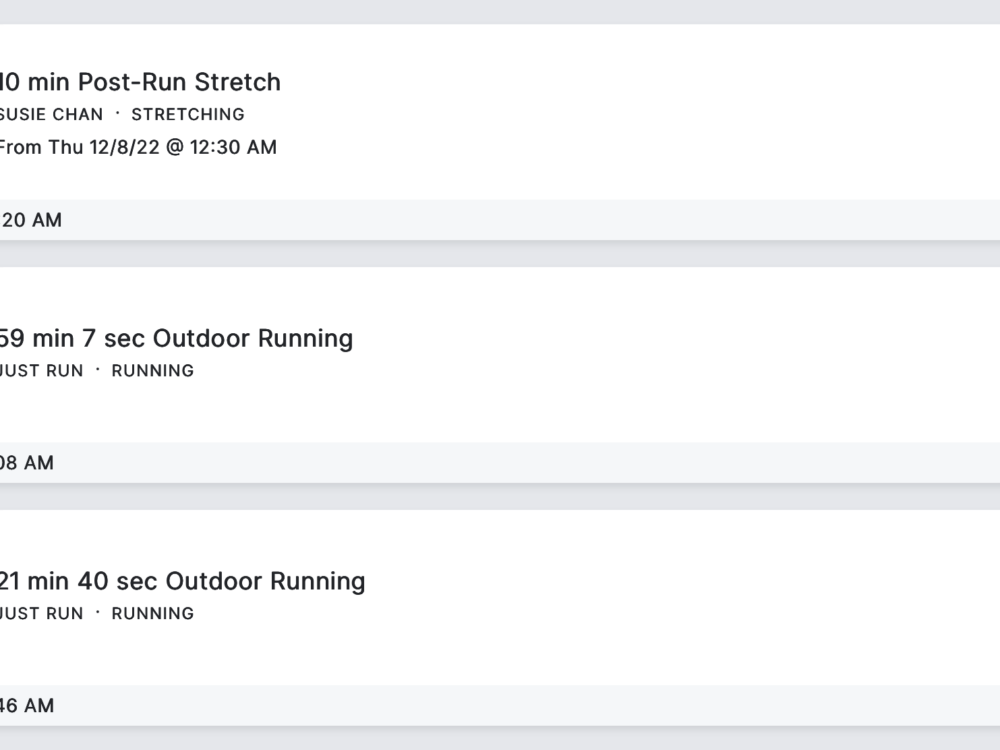 6 Miles Easy March 7, 2026 Start Time: 8:46 AM Duration: 80 Minutes 3 Miles Easy March 5, 2026 Start Time: 3:56 AM Duration: 39 Minutes 4 Miles Easy March 3, 2026 Start Time: 5:03 PM Duration: 55 Minutes 4 Miles Easy March 2, 2026 Start Time: 9:55 AM Duration: 50 Minutes