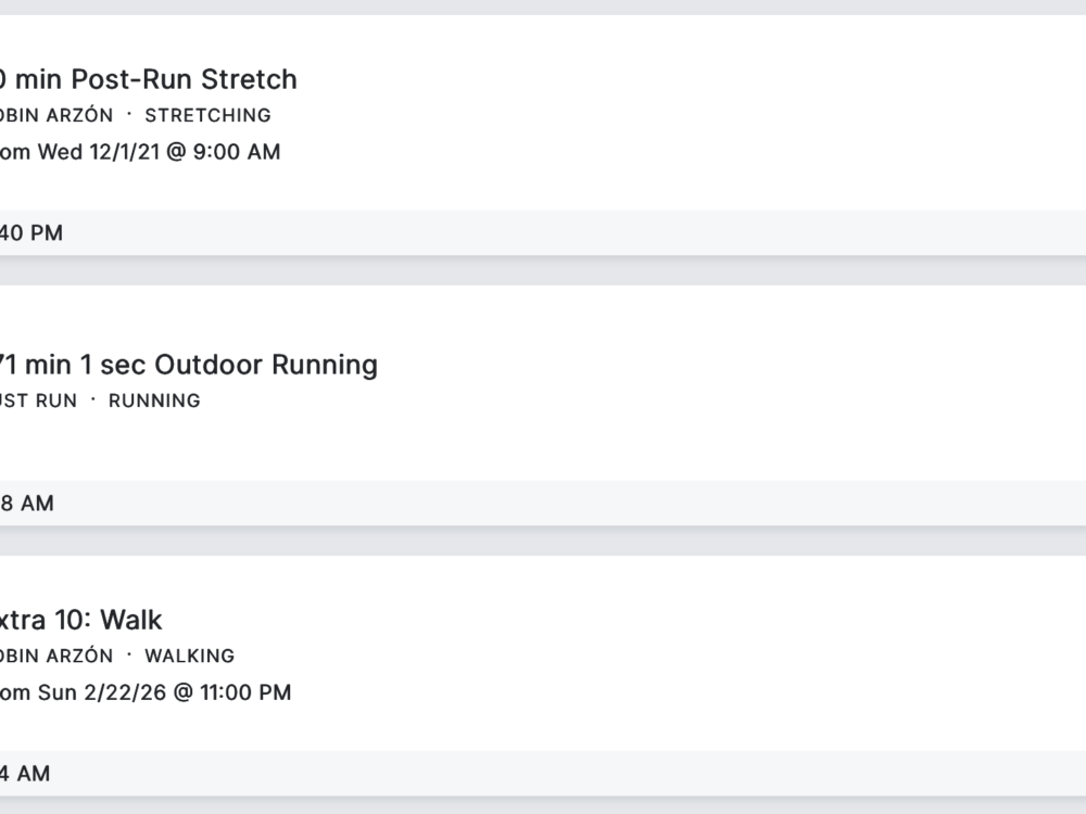 12 Miles Easy April 18, 2026 Start Time: 9:14 AM Duration: 171 Minutes 4 Miles Easy April 16, 2026 Start Time: 4:32 PM Duration: 54 Minutes 5 Miles Tempo April 14, 2026 Start Time: 10:56 AM Duration: 61 Minutes 5 Miles Easy April 13, 2026 Start Time: 4:41 PM Duration: 28 Minutes